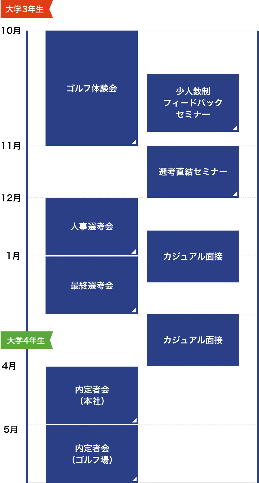 - 最後に、改めてゴルフの楽しさを感じられる場をご用意しました!内定者同士で仲を深めながら、プロのコーチに教わります。宿泊交通費は全額支給です!